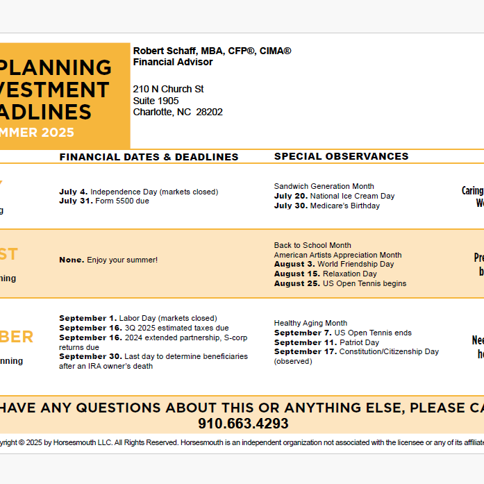 Use this reference to look ahead throughout the year to track important deadlines and actions you must take for your finances and health care. Questions? Please do not hesitate to contact us. Summer Key Planning Dates