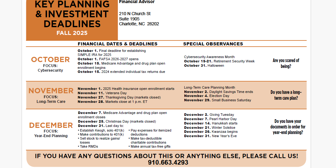 Oct162025Financial PlanningDownload here Key Planning and Investment Deadlines- Fall 2025 Category: Financial PlanningBy Robert SchaffOctober 16, 2025 Share this post Share on XShare on X Pin itShare on Pinterest Share on FacebookShare on Facebook Share on LinkedInShare on LinkedIn Post navigationPreviousPrevious post:OBBBA and 529 PlansNextNext post:Last Chance Financial Planning ChecklistMore ArticlesLast Chance Financial Planning ChecklistOctober 30, 2025OBBBA and 529 PlansSeptember 30, 2025Key College Funding DataAugust 21, 2025Decoding the One Big Beautiful Bill ActAugust 12, 2025Spring 2025- Key Planning & Investment DeadlinesJuly 1, 20256 Documents You Need to Preserve Family LegacyJune 10, 2025